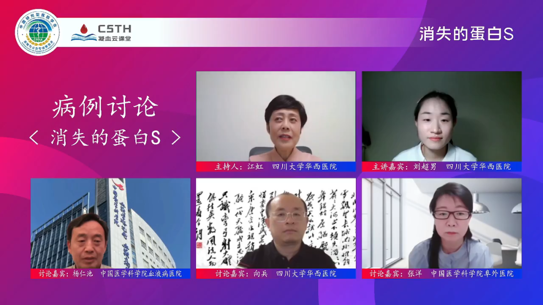 本期《病例討論:“消失”的蛋白S》邀請(qǐng)到了來自四川大學(xué)華西醫(yī)院的劉超男老師作為主講嘉賓,由四川大學(xué)華西醫(yī)院江虹教授擔(dān)任本期主持人,特邀中國醫(yī)學(xué)科學(xué)院血液病醫(yī)院楊仁池教授、四川大學(xué)華西醫(yī)院向兵教授、中國醫(yī)學(xué)科學(xué)院阜外醫(yī)院張洋老師三位討論嘉賓。