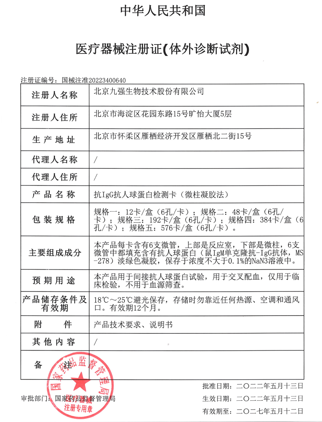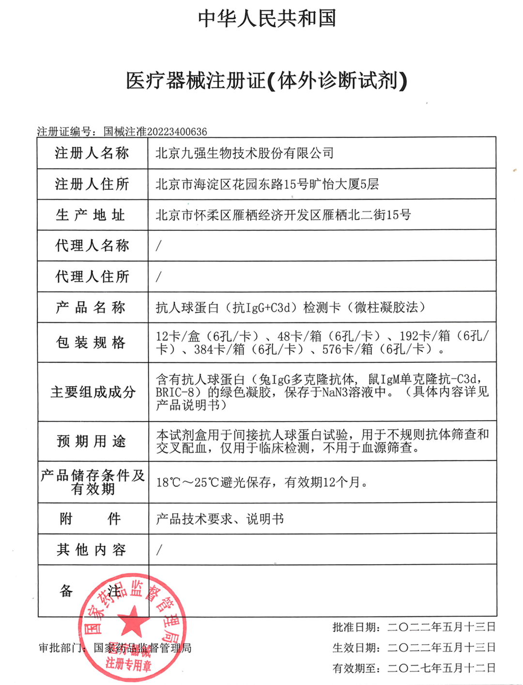 九強(qiáng)生物順利取得國(guó)家藥品監(jiān)督管理局頒發(fā)的抗人球蛋白(抗IgG+C3d)檢測(cè)卡(微柱凝膠法)和抗IgG抗人球蛋白檢測(cè)卡(微柱凝膠法)的《醫(yī)療器械注冊(cè)證》。