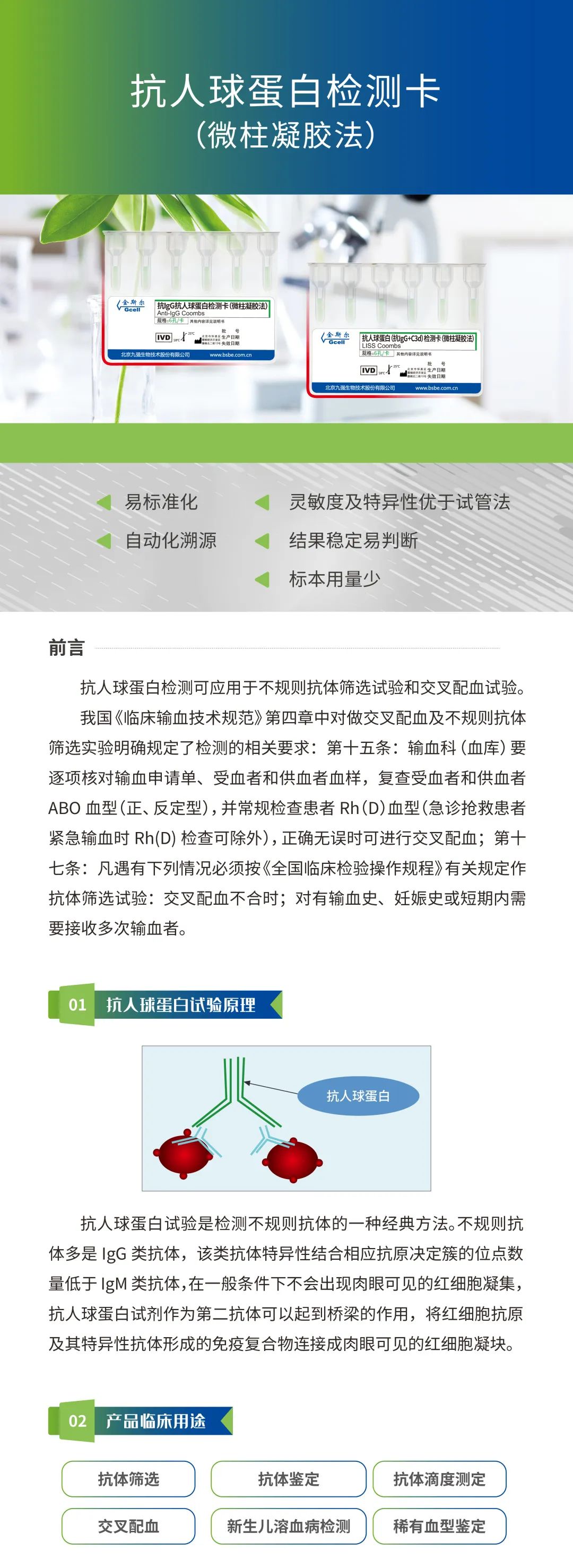 本產(chǎn)品用于間接抗人球蛋白試驗(yàn),用于交叉配血,僅用于臨床檢驗(yàn),不用于血源篩查。