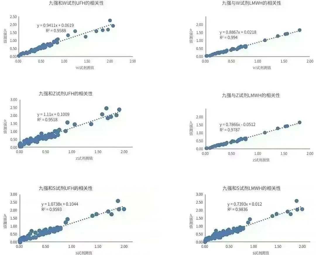 九強抗Xa測定試劑盒(發(fā)色底物法)通過顏色變化來測定抗凝強度/血藥濃度,線性寬,抗干擾能力強,精密度高,與市場主流廠家試劑相關(guān)性良好,R2>0.95,可滿足臨床檢測需求。