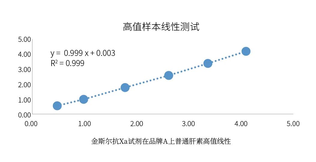 金斯?fàn)柨筙a試劑盒普通肝素線性可以做到4IU/mL,不僅可以滿足說明書所宣稱的1.2IU/mL,同時可以滿足臨床上的一些異常特殊高值樣本的檢測需求。