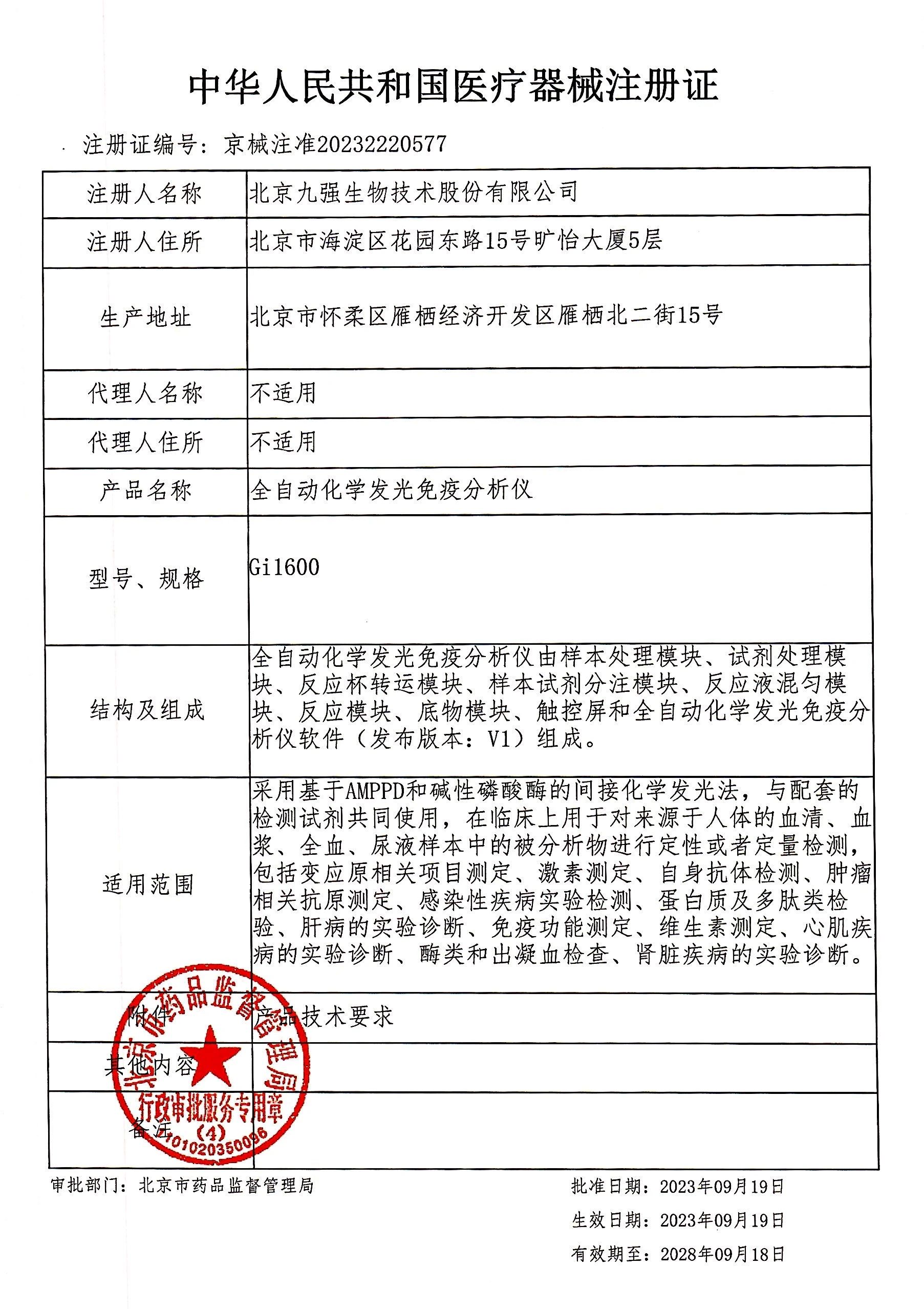 九強(qiáng)生物Gi1600全自動(dòng)化學(xué)發(fā)光免疫分析儀和Gi2000全自動(dòng)化學(xué)發(fā)光免疫分析儀順利獲得北京醫(yī)療器械監(jiān)督管理局頒發(fā)的《醫(yī)療器械注冊(cè)證》,注冊(cè)證號(hào)分別為京械注準(zhǔn)20232220577、京械注準(zhǔn)20232220578。