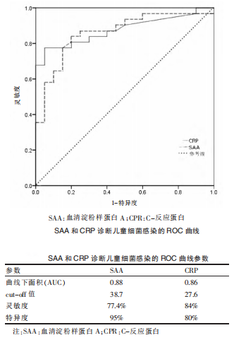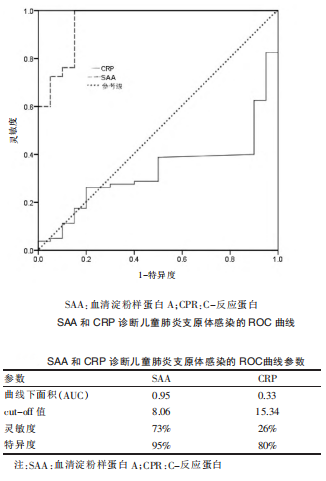 李攀等[3]探討血清淀粉樣蛋白A(SAA)和C-反應蛋白(CPR)檢測對兒童支原體肺炎的診斷價值。包括支原體感染患兒124例(支原體感染組)、細菌感染患兒35例(細菌感染組),同期健康體檢兒童20例(對照組),分別測定和分析三組SAA和CRP水平,并應用ROC曲線進行分析。結(jié)果表明:SAA檢測對診斷兒童肺炎支原體感染和細菌感染的準確性均較高;CRP檢測對診斷兒童細菌感染準確性較高,但對于鑒別診斷兒童肺炎支原體的意義較小。SAA 檢測可用于兒童肺炎支原體感染的鑒別診斷,應在臨床中廣泛應用。