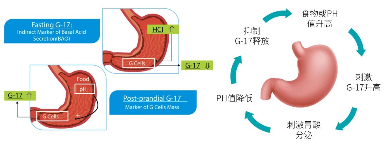 G-17與胃酸形成負(fù)反饋機(jī)制,胃竇功能正常時(shí)該機(jī)制可維持胃酸分泌的動(dòng)態(tài)平衡;當(dāng)胃竇萎縮時(shí),該機(jī)制失衡。