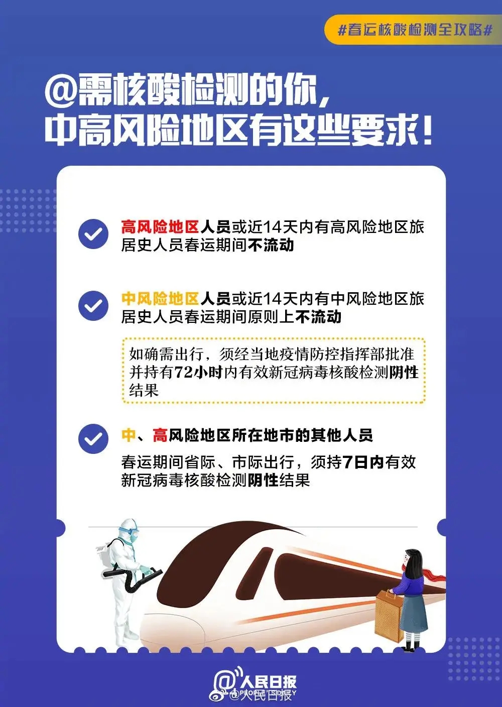 今天是2021春運第1天。高中低風險地區(qū)有哪些具體要求?什么情況需要做核酸檢測?如何預約?核酸檢測必知注意事項有哪些?**要求↓↓有用,擴散周知!