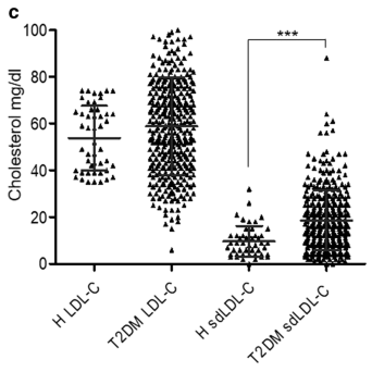 平頂山市人民醫(yī)院內(nèi)分泌與代謝科的田勇等人[5],招募了包括352名T2DM患者(男194名,女158名,平均年齡60.63歲)和48名健康人(男34名,女14名,平均年齡45.38歲)的受試者。探討多基因多態(tài)性、LDL-C和sdLDL-C在T2DM治療中的臨床價(jià)值。研究時(shí)間從2018年5月至2020年1月。研究發(fā)現(xiàn),sdLDL-C主要存在于T2DM患者體內(nèi),且T2DM患者sdLDL-C的平均水平高于健康人。治療后,LDL-C和sdLDL-C的表達(dá)較治療前降低且差異顯著(p?0.001)。結(jié)果表明,sdLDL-C是T2DM的高危因素。LDL-C和sdLDL-C是T2DM治療的良好監(jiān)測(cè)生物標(biāo)志物。