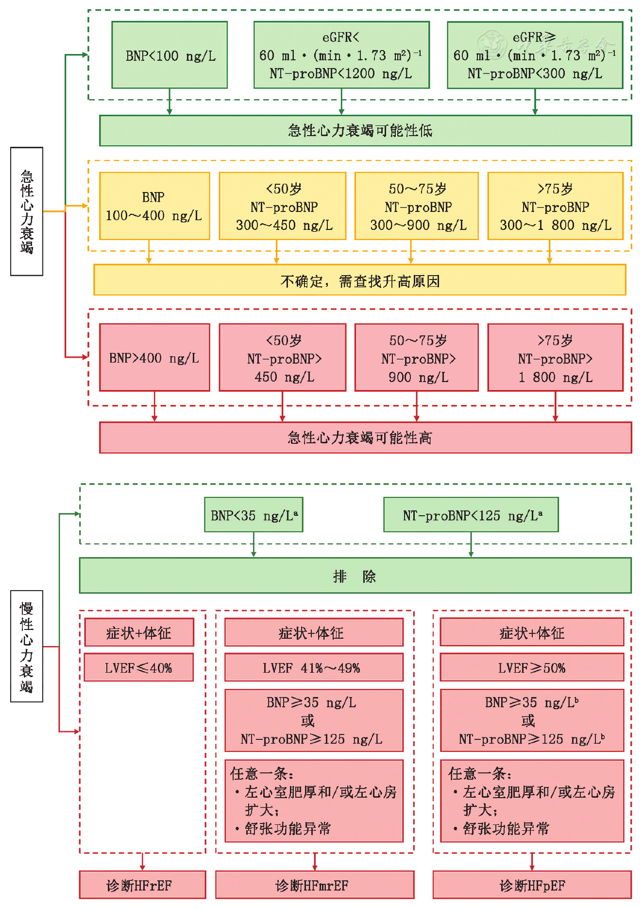 BNP和NT?proBNP均為心力衰竭診斷和鑒別診斷的**標志物,但二者檢測方法多樣,不同檢測方法結果間不能直接比較。因二者的分子結構、清除途徑和半衰期的差異,臨床應用中需注意年齡、肥胖、腎功能和藥物對其影響。對于腎功能不全[eGFR<60ml·(min·1.73m2)-1]和肥胖者(BMI>30kg/m2)BNP/NT?proBNP用于排除和診斷心力衰竭時需采用校正的截斷值。